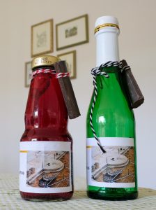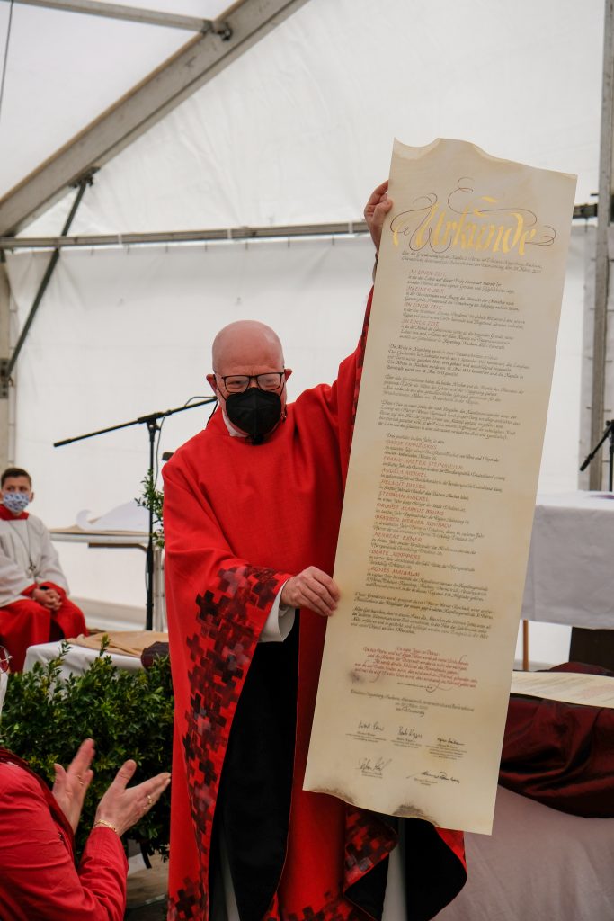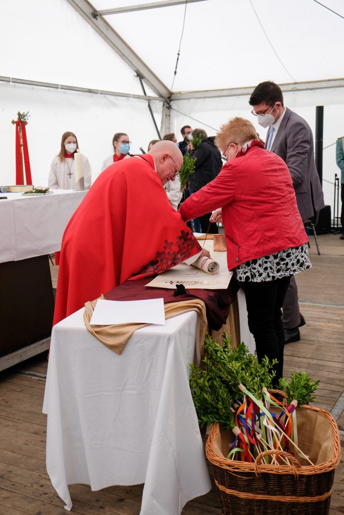 Nicht nur wegen der beginnenden Karwoche, sondern auch wegen der Pandemieschutzbestimmungen verbot sich ein anschließendes gemütliches Beisammensein der Gemeinde. Als Andenken an diesen besonderen Tag erhielt jeder entweder einen Piccolo oder ein Saftfläschchen mit einem Bild der Baustelle und einen kleinen Tonstein, der aus dem Ton der späteren Dachpfannen gebrannt war.