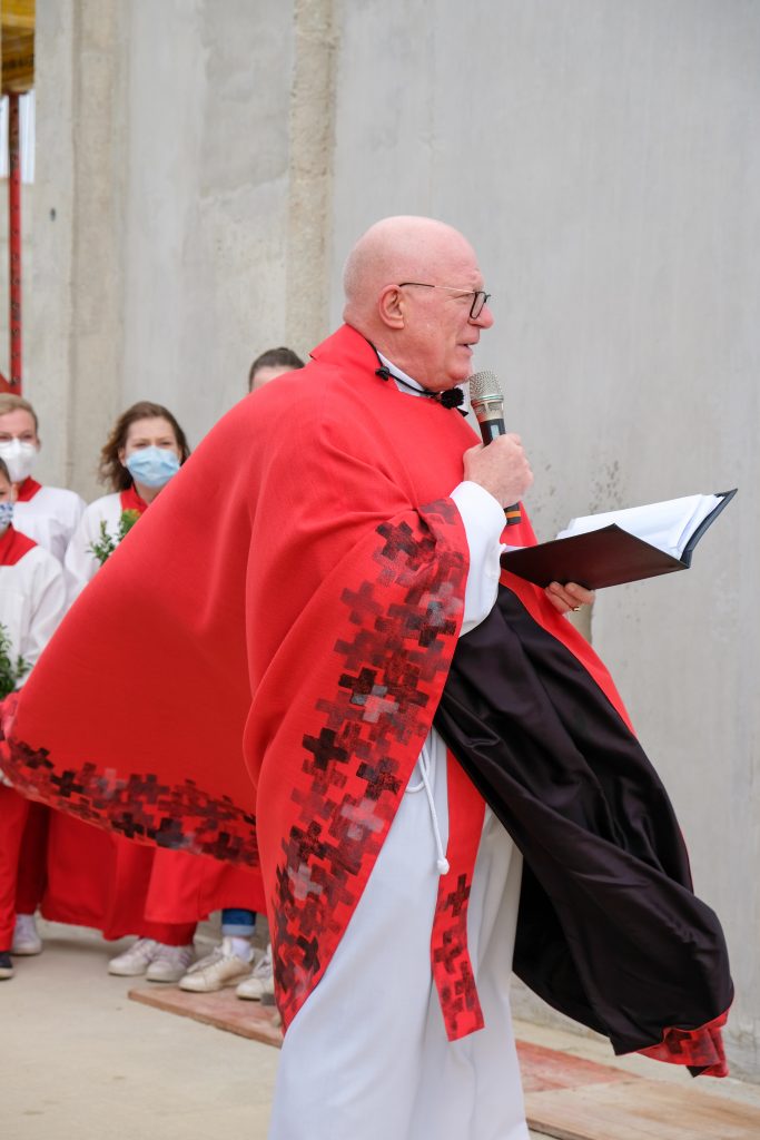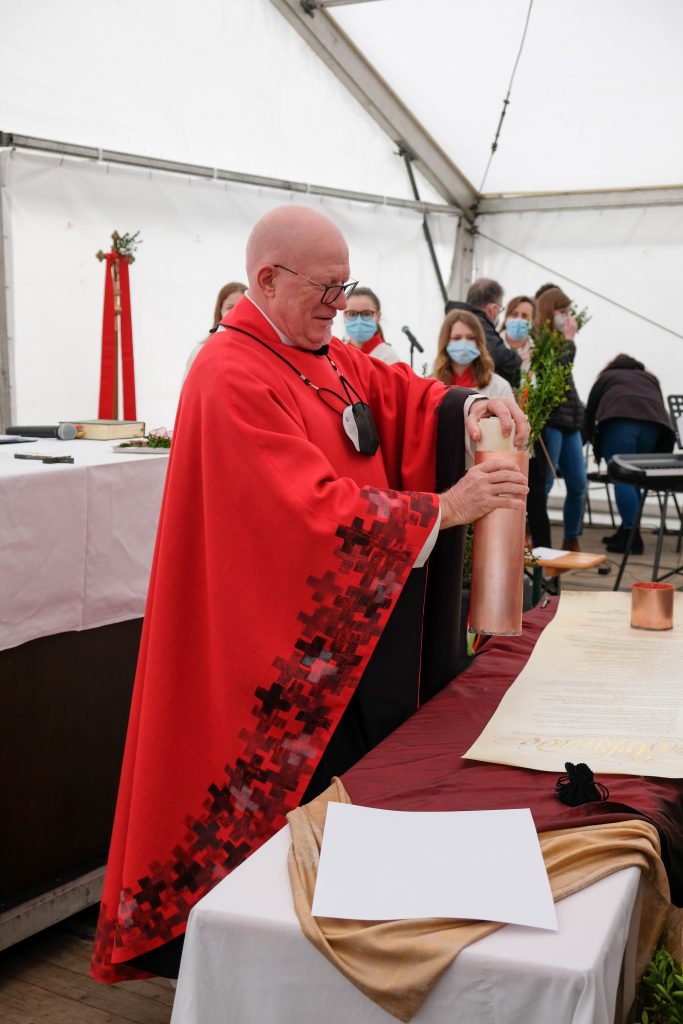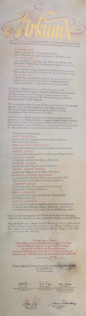 Unter strengen Corona-Schutzmaßnahmen fand am 28. März 2021, am Palmsonntag, die Grundsteinlegung der Kapelle Sankt Petrus und des Begegnungszentrums statt. Die Vorsitzende des Kapellenvorstandes, Agnes Maibaum, begrüßte vor der Messfeier die Ehrengäste und die Bürger der betroffenen Gemeinden. Pastor Rombach, Pfarrer der Kirchengemeinde Christkönig Erkelenz, gestaltete die Messe und segnete die Palmzweige, die von der Keyenberger Bruderschaft liebevoll gesteckt worden waren und die Gegenstände, die in die Urkundenhülse für den Grundstein gelegt werden sollten. Dies sind die Zeitungsausgaben der Rheinischen Post und der Aachener Zeitung vom Vortag, eine Pergamentrolle mit den Ereignissen und Personennamen, die zum Zeitpunkt der Grundsteinlegung wichtig sind, und ein Beutel mit den gerade gültigen Geldmünzen. Die Urkunde wurde vom Bürgermeister der Stadt Erkelenz, vom Vorsitzenden des Kirchenvorstands und der Vorsitzenden des Pfarrgemeinderats Christkönig Erkelenz, von der Vorsitzenden des Kapellenvorstands und von Pastor Werner Rombach unterschrieben. Die Urkunde wurde in zweifacher Kopie angefertigt; das Duplikat soll später als dauerhafte Erinnerung im Gebäude aufgehängt werden. Durch die Länge der Pergamentrolle (zwei Meter), nahm es einige Zeit in Anspruch, die Utensilien in die vorgesehene Hülse zu stecken.