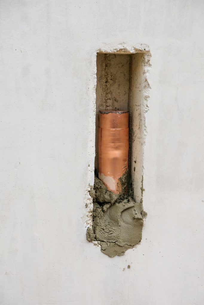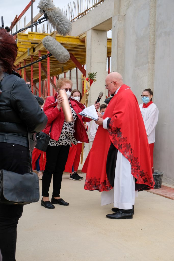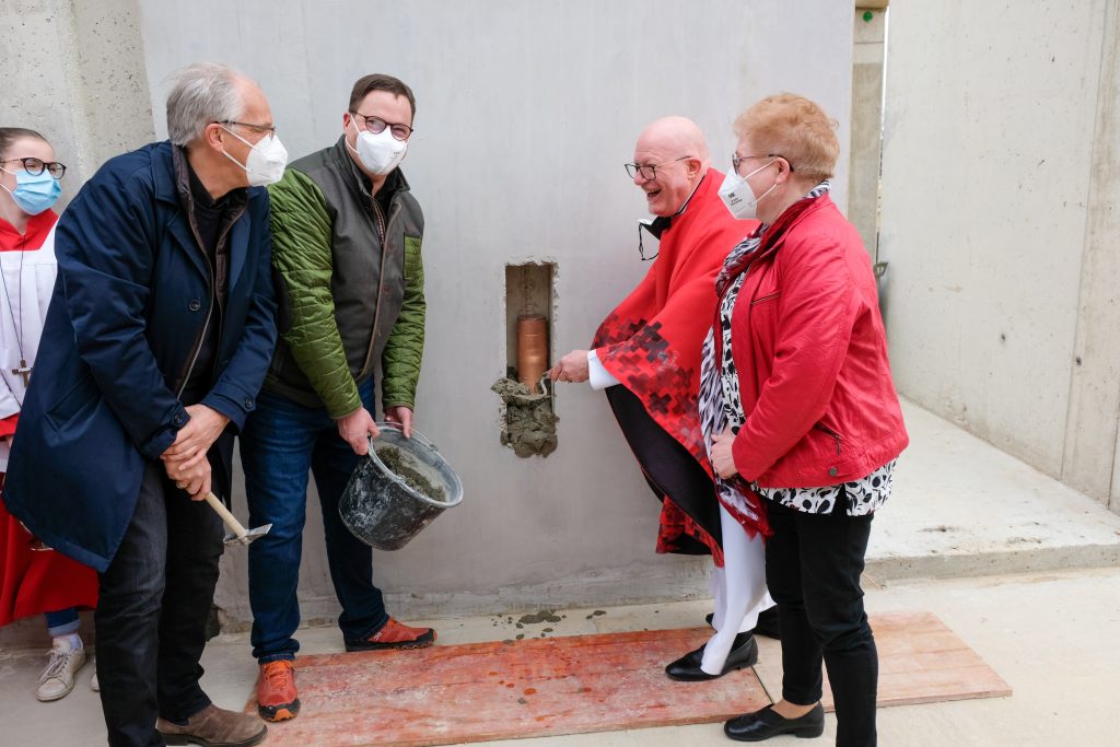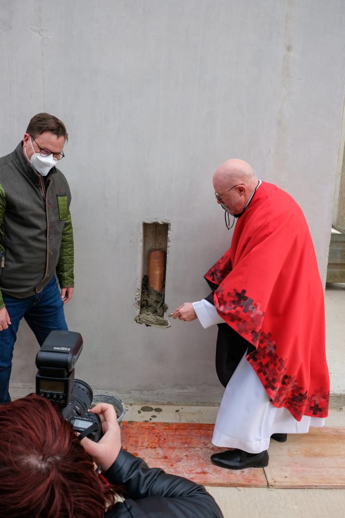 Nach der Messe zogen die Anwesenden zur gegenüberliegenden Baustelle, wo Herr Pastor Rombach den Behälter in die vorgesehene Maueraussparung in der Westwand der Kapelle legte und sie symbolisch zumauerte.
