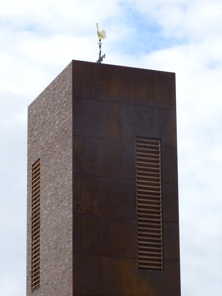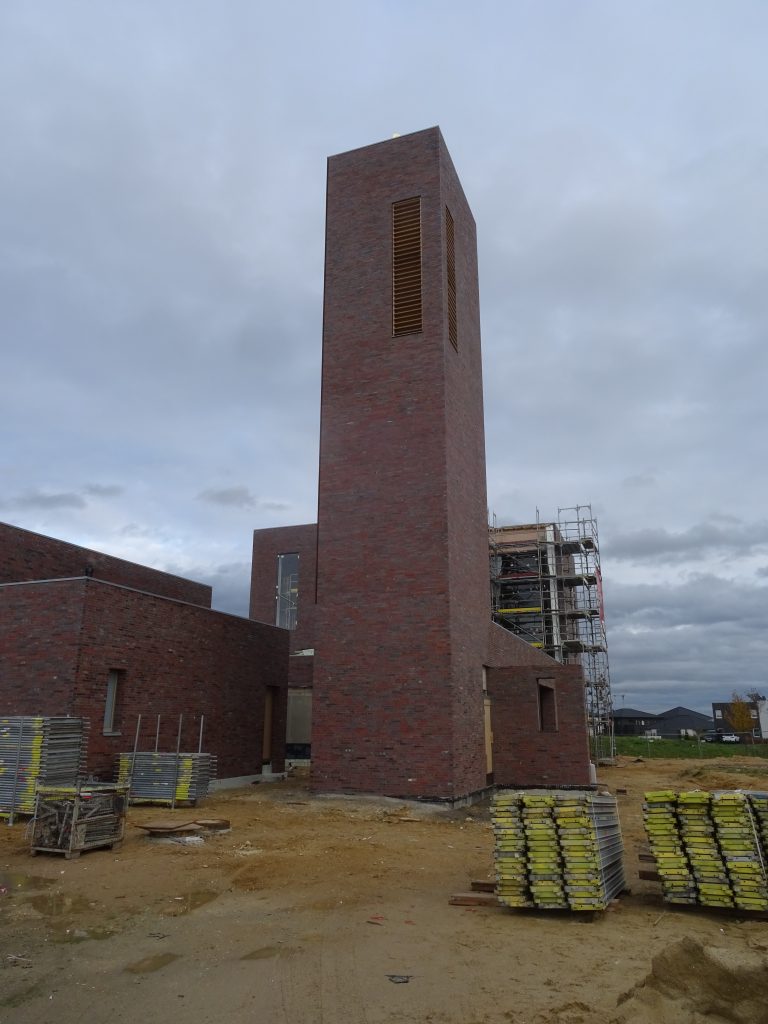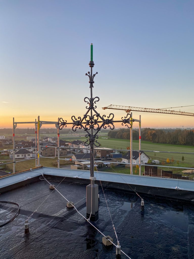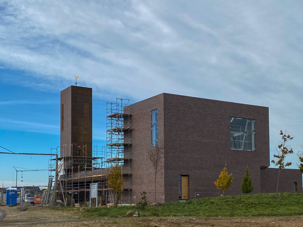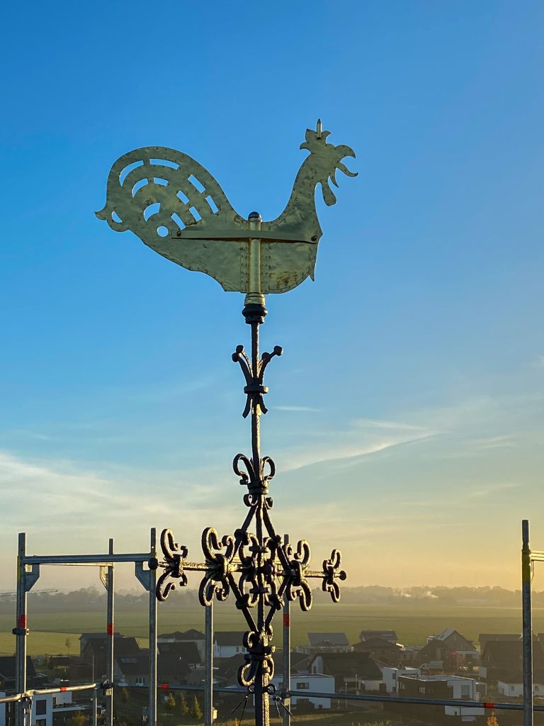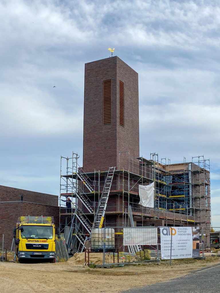 Am 29.10.2021wurde am Neubau der Sankt Petrus Kapelle im Neubaugebiet das Turmkreuz mit Wetterhahn und anschließend das Gerüst des Turmes abgebaut. Turmkreuz und Wetterhahn stammen noch aus der Vorgängerkirche der heutigen Heilig Kreuz Kirche in Keyenberg und lagerten dort seit Jahrzehnten im Turm. Sie wurden wieder aufgearbeitet und zieren nun die neue Kapelle. Rainer Merkens hat die folgenden Impressionen vom Turm und den Blick über das Neubaugebiet festgehalten.