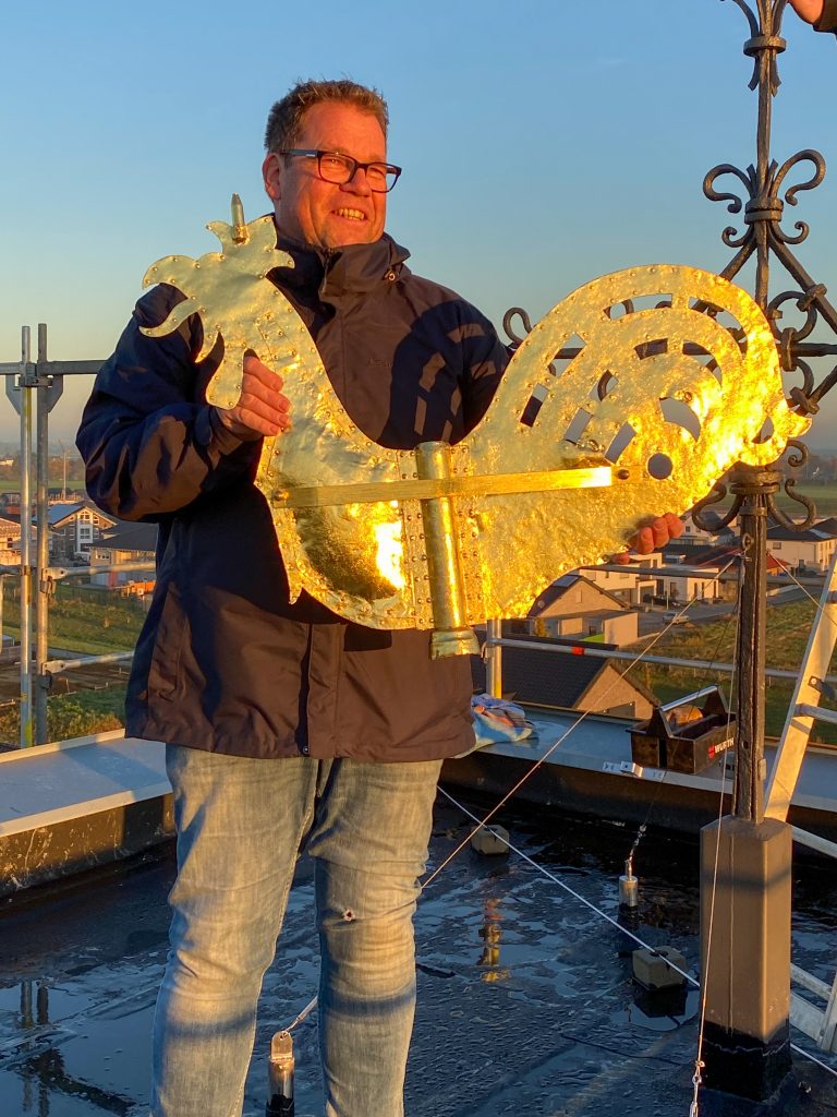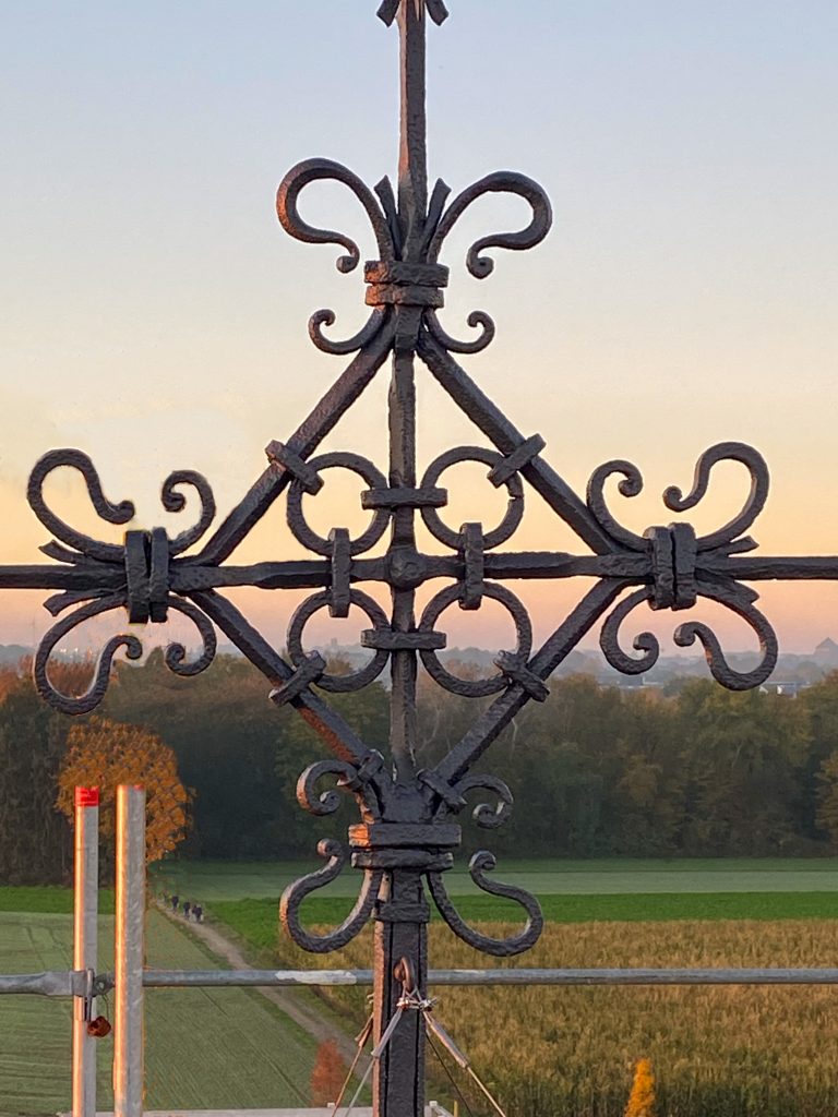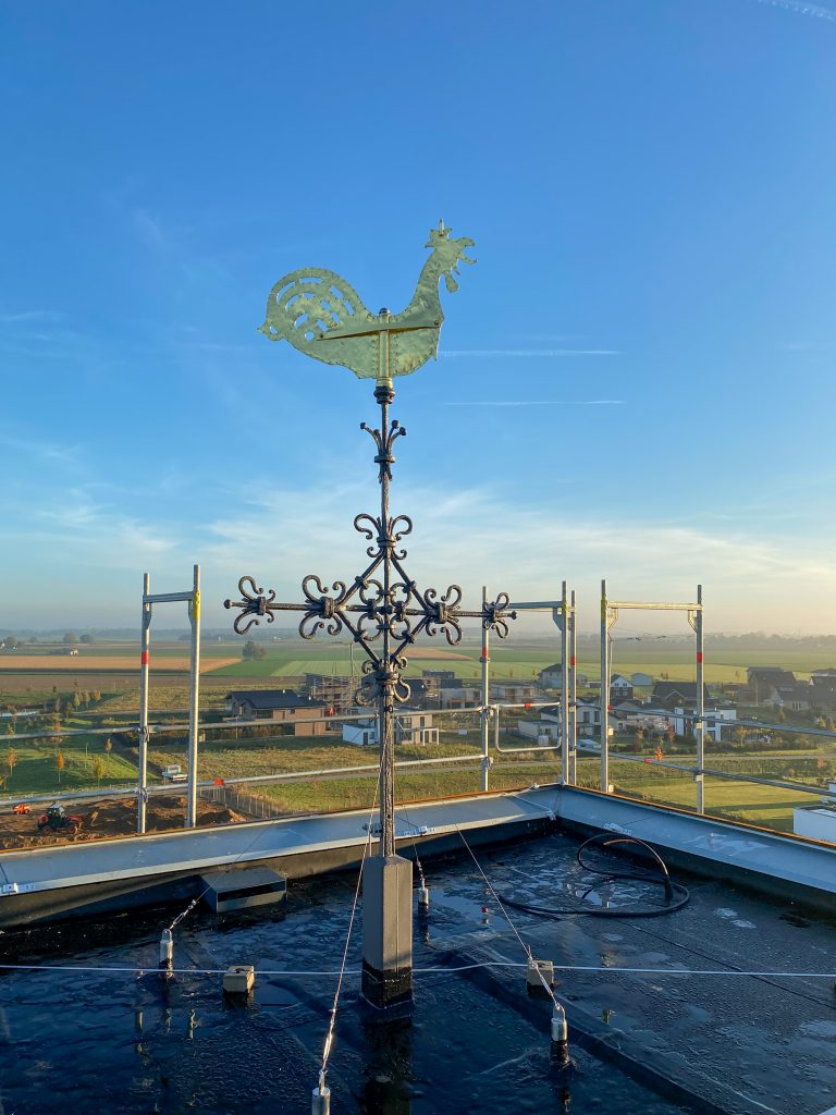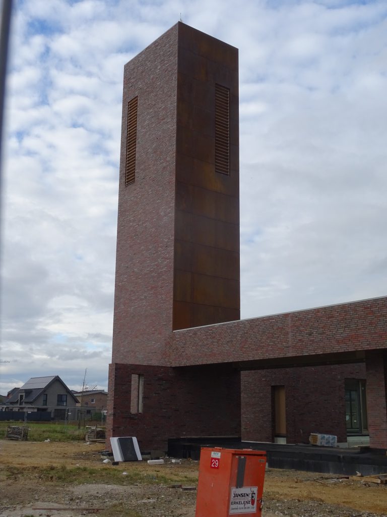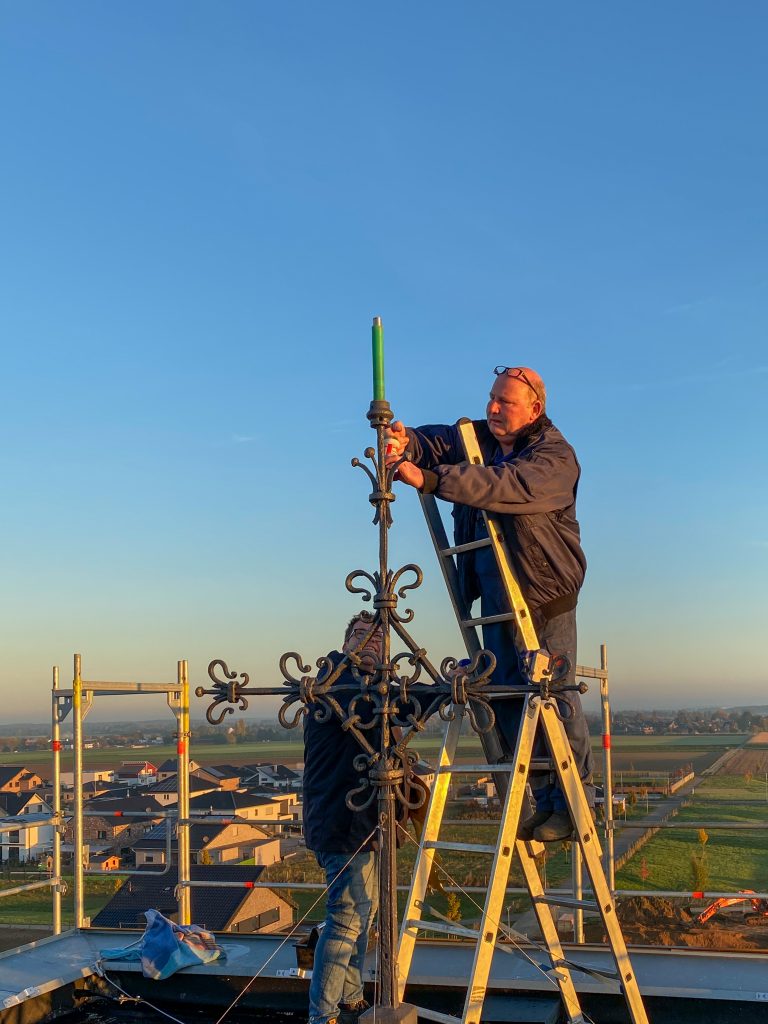 Am 29.10.2021wurde am Neubau der Sankt Petrus Kapelle im Neubaugebiet das Turmkreuz mit Wetterhahn und anschließend das Gerüst des Turmes abgebaut. Turmkreuz und Wetterhahn stammen noch aus der Vorgängerkirche der heutigen Heilig Kreuz Kirche in Keyenberg und lagerten dort seit Jahrzehnten im Turm. Sie wurden wieder aufgearbeitet und zieren nun die neue Kapelle. Rainer Merkens hat die folgenden Impressionen vom Turm und den Blick über das Neubaugebiet festgehalten.