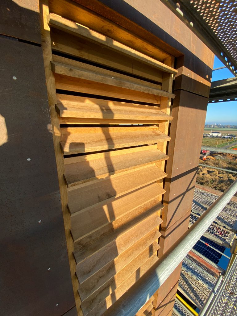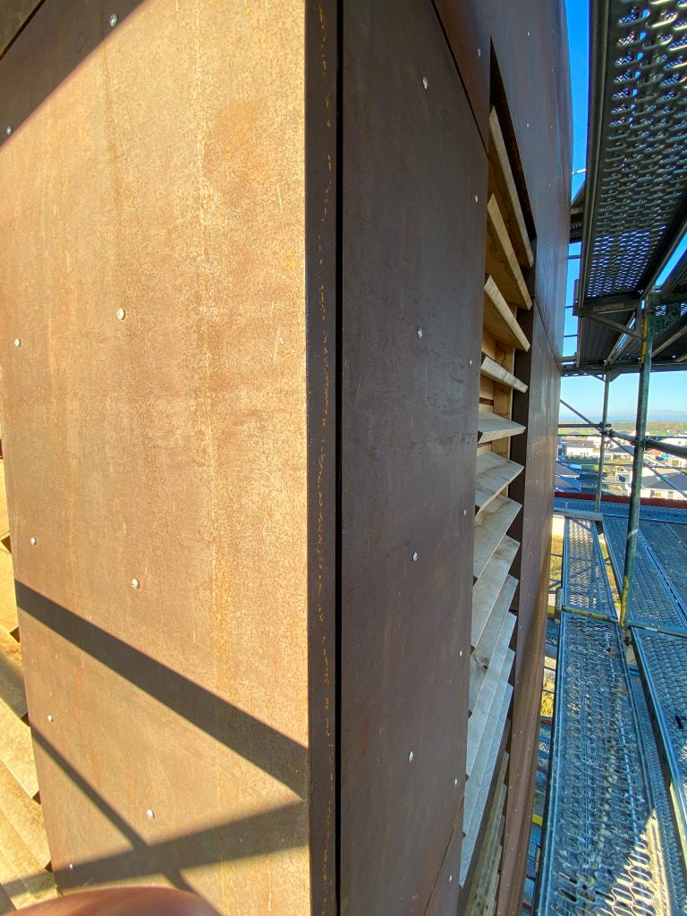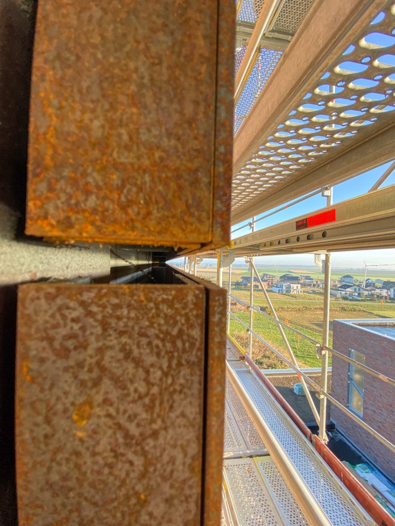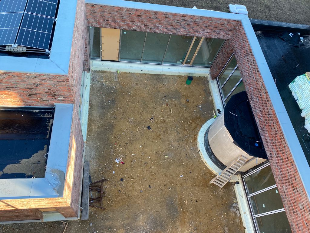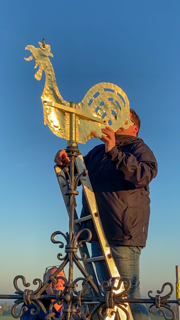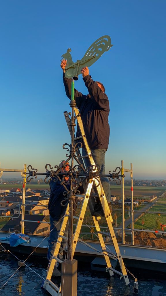 Am 29.10.2021wurde am Neubau der Sankt Petrus Kapelle im Neubaugebiet das Turmkreuz mit Wetterhahn und anschließend das Gerüst des Turmes abgebaut. Turmkreuz und Wetterhahn stammen noch aus der Vorgängerkirche der heutigen Heilig Kreuz Kirche in Keyenberg und lagerten dort seit Jahrzehnten im Turm. Sie wurden wieder aufgearbeitet und zieren nun die neue Kapelle. Rainer Merkens hat die folgenden Impressionen vom Turm und den Blick über das Neubaugebiet festgehalten.