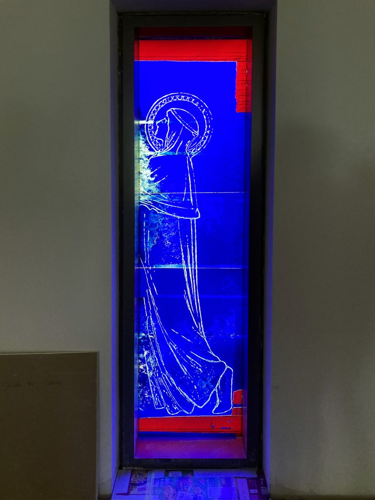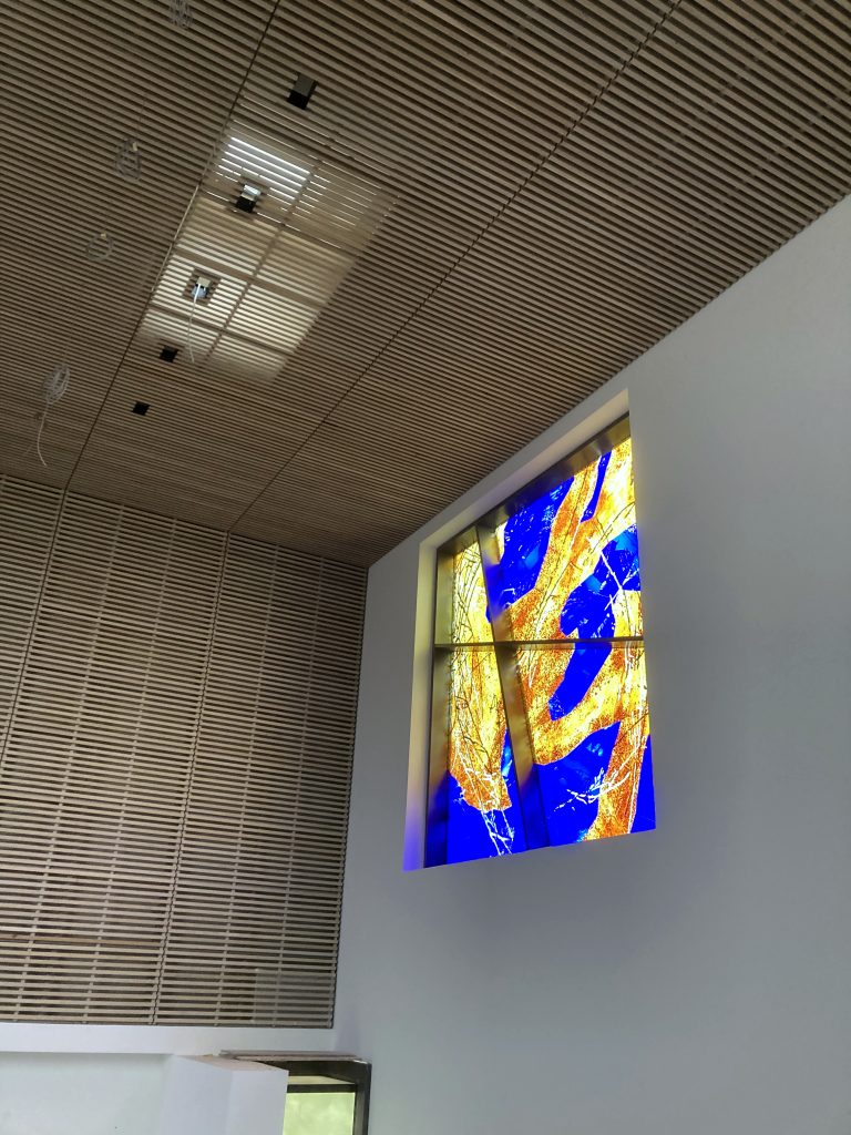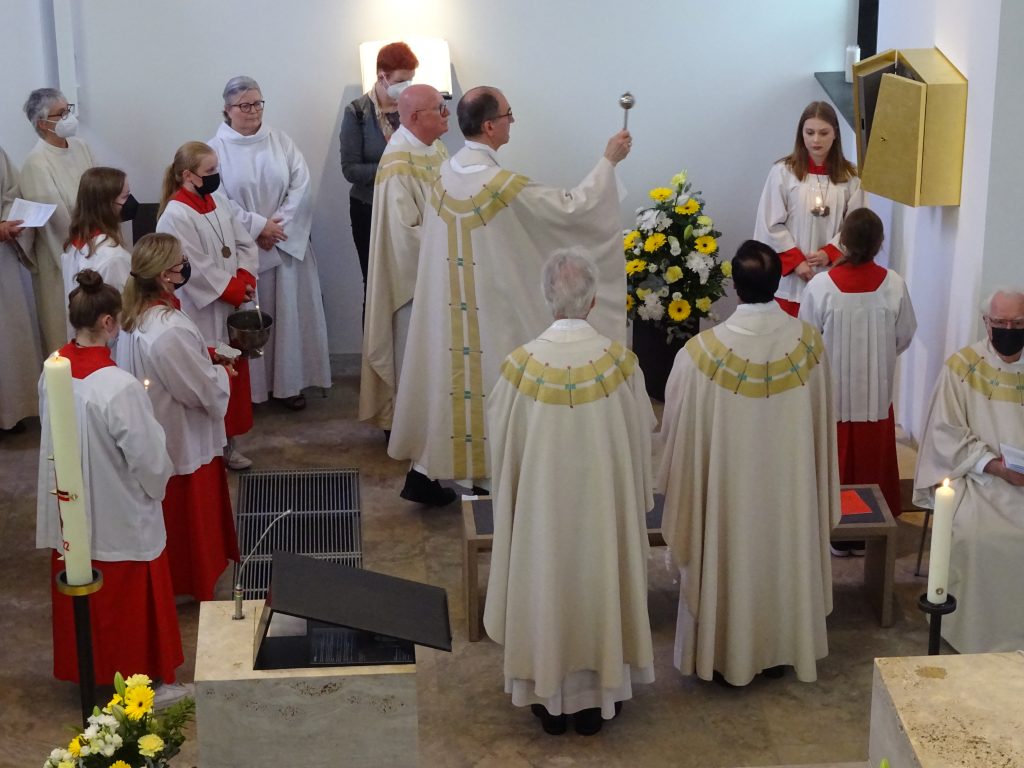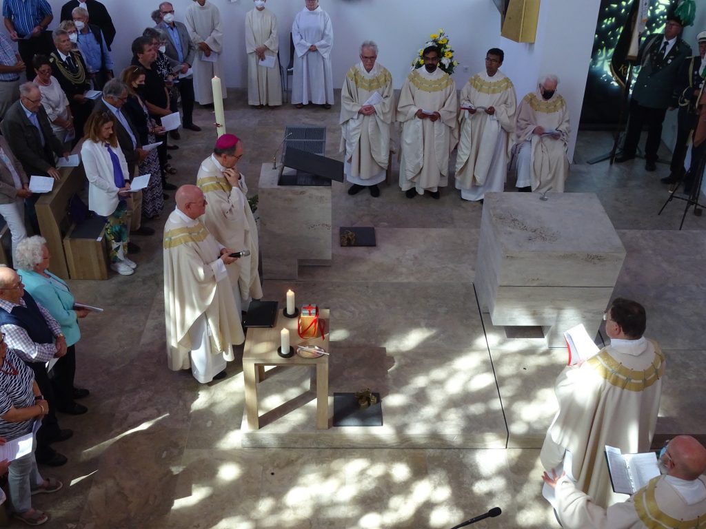 Am Sonntag, dem 20. Februar 2022, hatten alle Bewohner und Interessenten die Möglichkeit, sich einen Eindruck vom Innenraum der Kapelle Sankt Petrus zu machen. Trotz des schlechten Wetters konnte man eine Vorstellung von der Helligkeit und der besonderen Farbgebung des Kapellenraums durch die modernen Fenster bekommen. Gerade die in Blau- und Goldgelbtönen gehaltenen modernen Fenster geben dem Raum eine besondere Atmosphäre. Im Altarraum steht bereits ein steinerner Altar mit Ambo. Folgende Bilder geben einen kleinen Eindruck vom Innenraum der Kapelle.