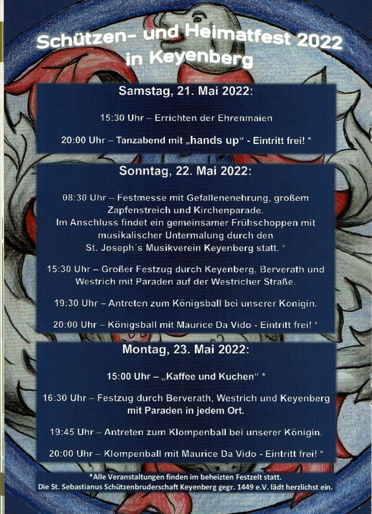 Vom 21.05. bis zum 23.05. feierte die Sankt Sebastianus Schützenbruderschaft Keyenberg ihr erstes Schützenfest am neuen Ort. Neben dem bestehenden Zelt am Keyenberger Markt wurde ein weiteres, größeres Zelt aufgebaut. Der Ablauf entsprach im Wesentlichen dem der alten Schützenfeste, nur der Schützenzug musste einen anderen Weg gehen. Auch waren weniger Kirmesbuden als in den Jahren zuvor vorhanden, was auch daran lag, dass durch Corona die Schausteller nicht mehr unbedingt kleine Ortschaften wegen des zu erwartenden Umsatzes besuchen möchten. Immerhin konnten die kleinen Kinder Karussell fahren. Bilder des Schützenfestes findet ihr unter dem Artikel zur Sankt Sebastianus Schützenbruderschaft Keyenberg.