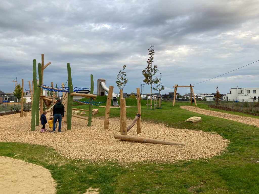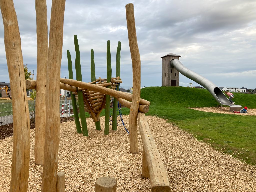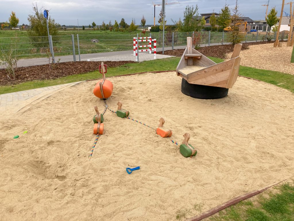 Im September konnten die Kinder der Neubaugebiete endlich ihren Spielplatz in Besitz nehmen. Er bietet zahlreiche Klettermöglichkeiten, eine Rutsche, die aber noch nicht in Betrieb ist, weil noch zwei Streben fehlen, einen Sandkasten mit einem Holzschiff und eine Seilbahn. Bei einem Besuch des Spielplatzes fragten allerdings einige Kinder, warum keine Schaukel vorhanden sei.