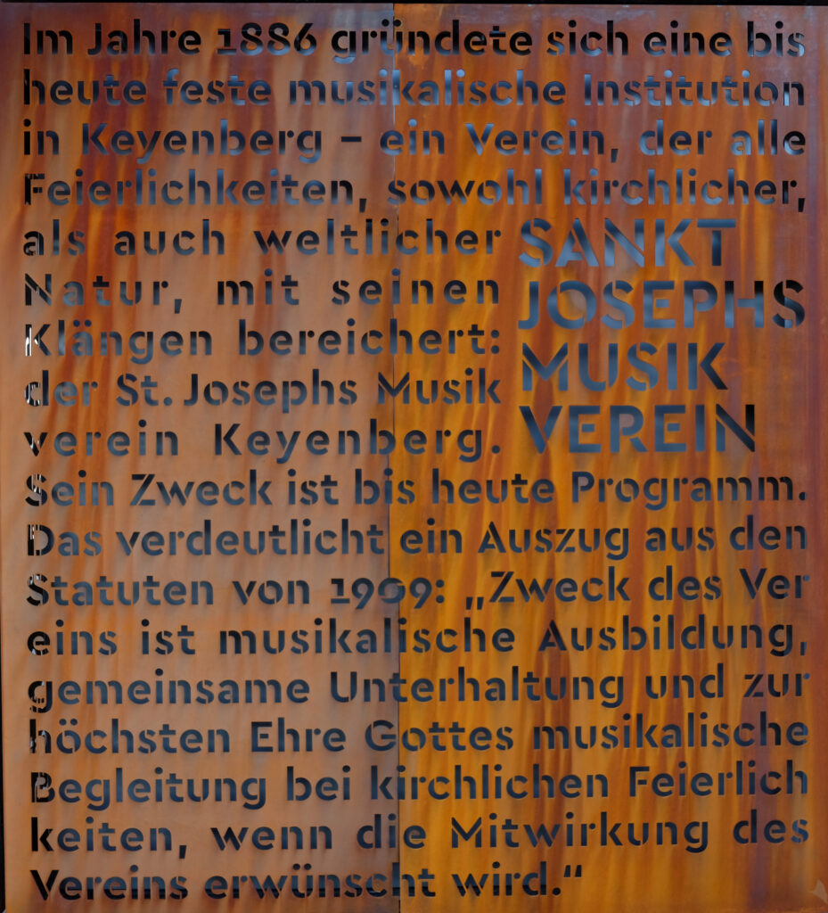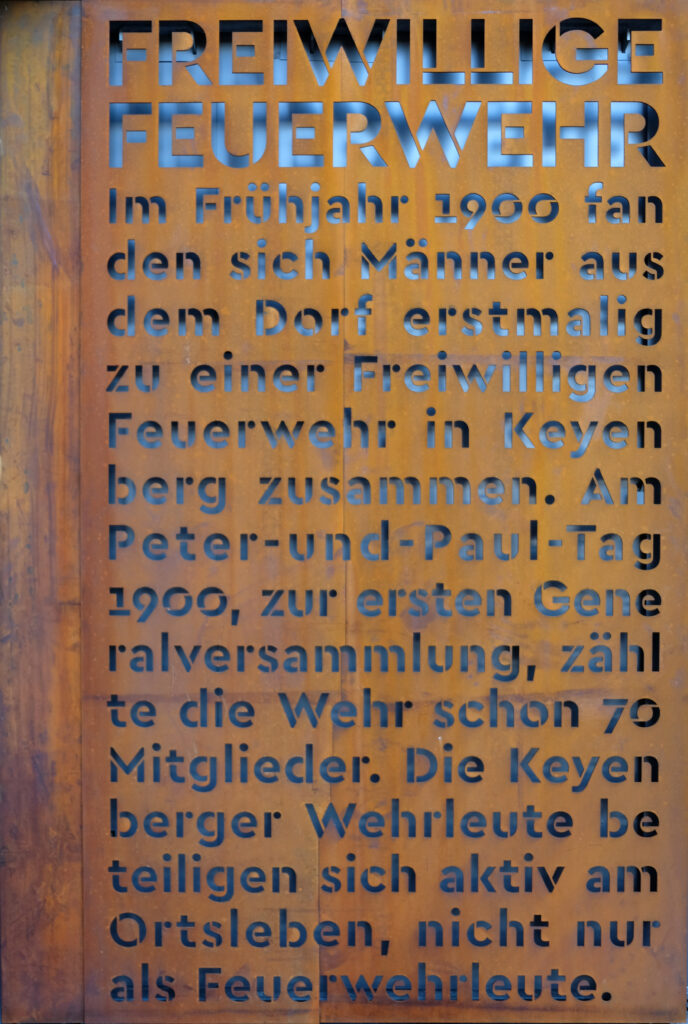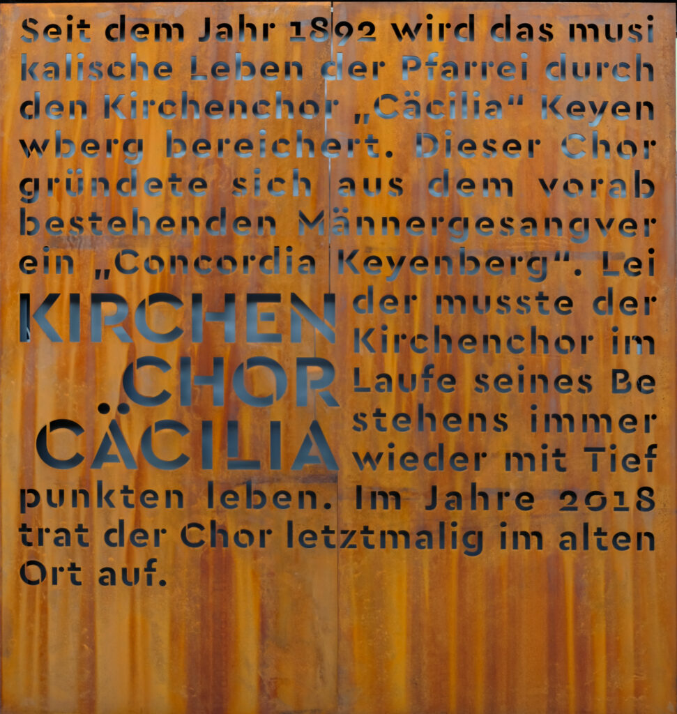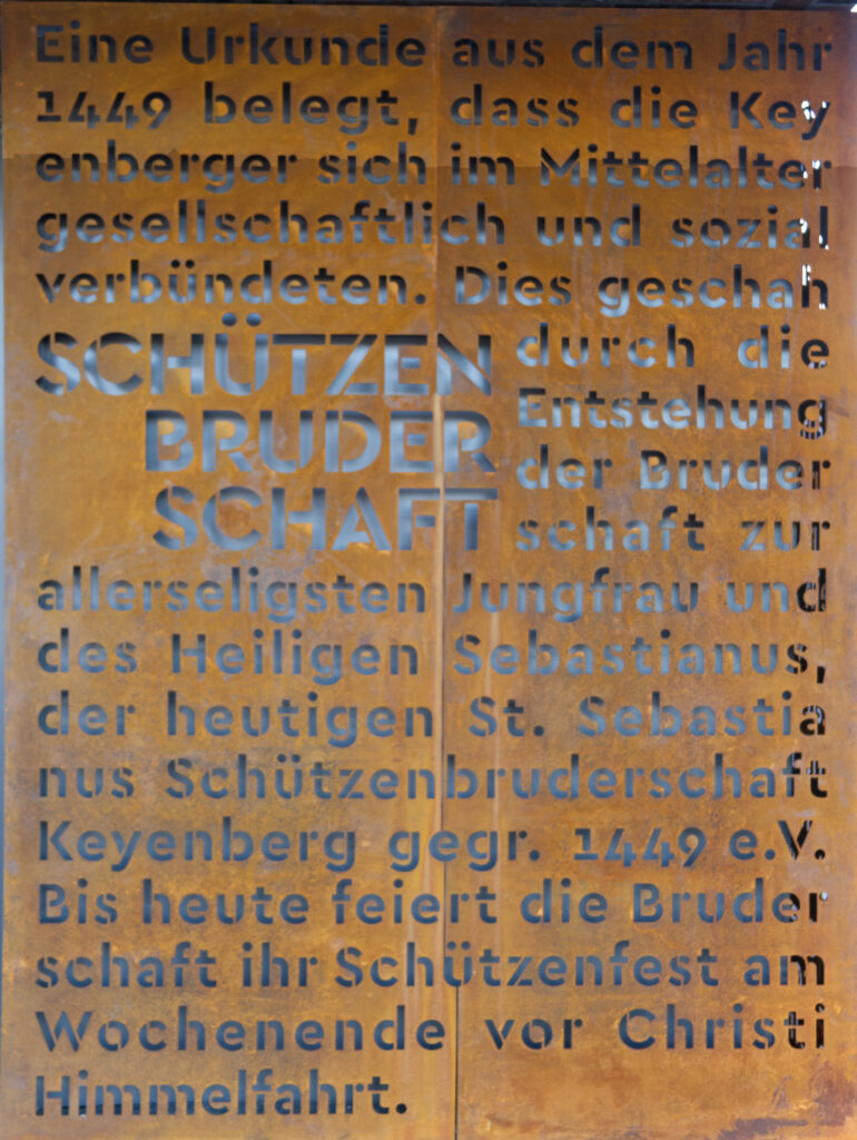 Das Gebäude enthält einen Veranstaltungssaal mit einer Grundfläche von 315 qm und einen Vereinsraum , der 45 qm groß ist. Die Besonderheit des Gebäudes befindet sich an der Außenseite. Hier wird auf großen Cortenstahlplatten die Geschichte der einzelnen Umsiedlungsorte und der Vereine in Keyenberg alt dargestellt. Leider hat sich hier auf einer Platte ein Fehler eingeschlichen. Da ist von „Keyen-w-berg“ statt „Keyenberg“ die Rede. Dieser Fehler soll aber noch behoben werden.