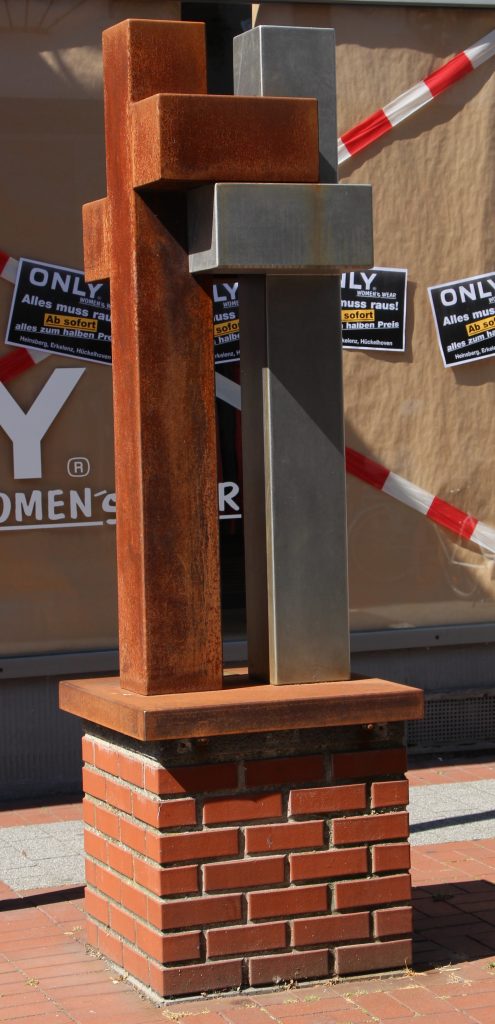 Das blaugraue Kreuz wurde während der 500-Jahre-Lambertiturm-Festwoche aufgestellt. Es besteht aus Bodenplatte, Schaft und dem Oberteil mit den Kreuzarmen, diese weisen eine gleiche Länge von 1,10 m und eine Stärke von 0,55 m auf. Das Kreuz hat eine Gesamthöhe von 3,80 m, der Schaft wiegt eine Tonne, das gesamte Kreuz 1,5 Tonnen.