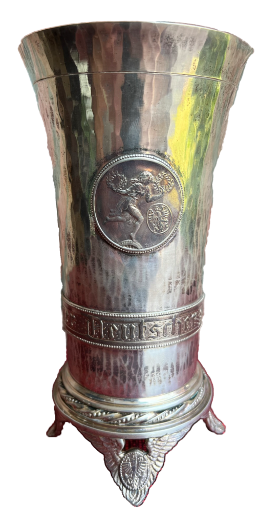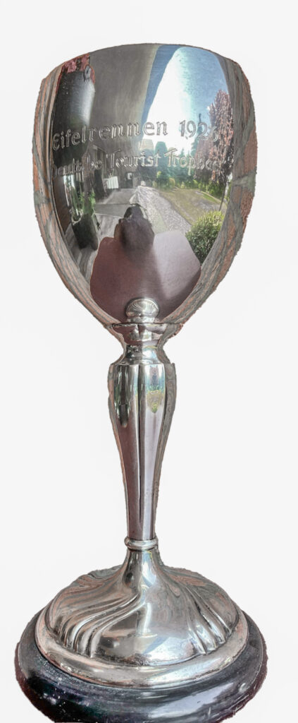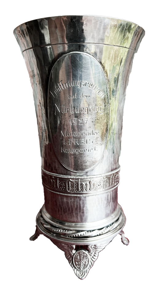 Ein prachtvoller Silberpokal auf schwarzem Marmorsockel. Auch einen Ring gewann er, ein mit einer Gemme gezierter goldener Ring, der die Nürburg zeigt (Nürburgring).