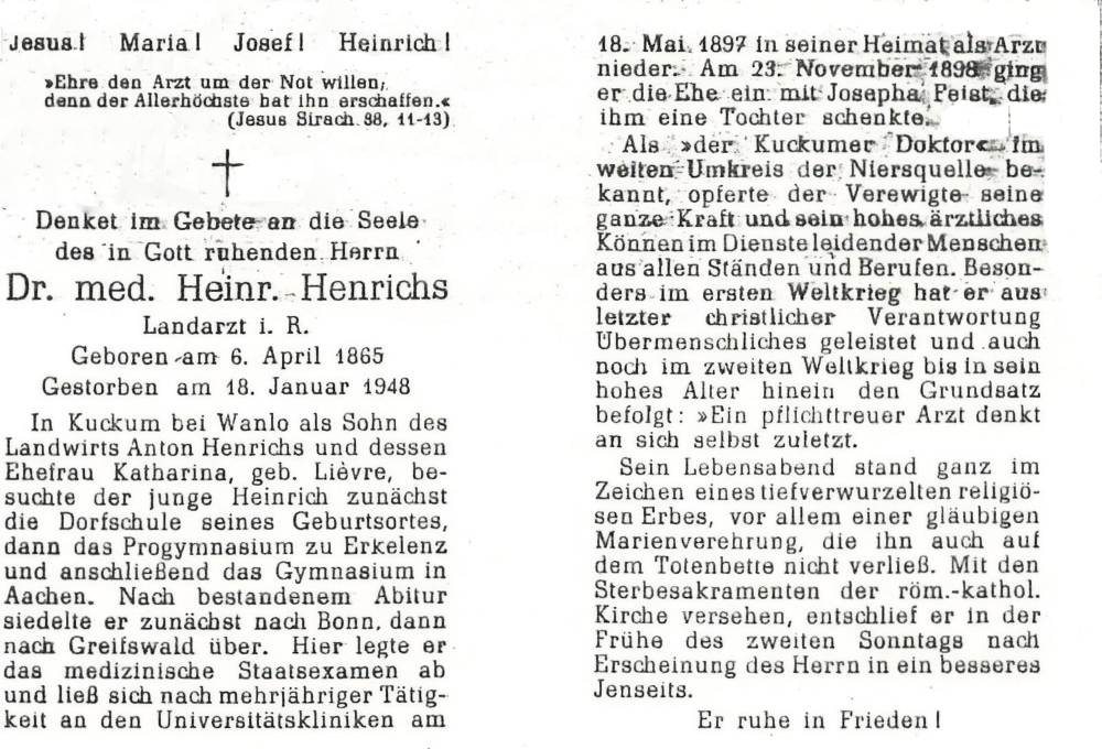 Wie dem Totenzettel zu entnehmen ist, leistete er auch im Ersten und Zweiten Weltkrieg seinen ärztlichen Dienst am Menschen bis zu seinen körperlichen Grenzen. Immerhin war Heinrich Henrichs im Zweiten Weltkrieg schon weit über 70 Jahre alt.