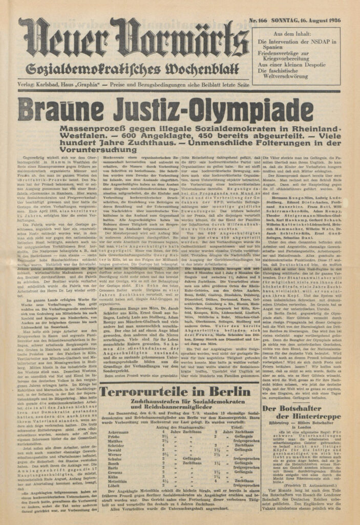 Der „Neuer Vorwärts“ berichtet am 16. August 1936 ausführlich über einen Massenprozess gegen Sozialdemokraten. In diesem Prozess wurde Jack Schiefer verurteilt.
