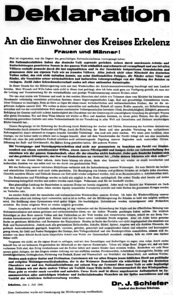 Am 19. März 1945 kehrte Schiefer von Sinnersdorf, wo er mit Frau und 2 Töchtern evakuiert war, nach Erkelenz zurück, welches am 26. Februar durch die Amerikaner eingenommen worden war. Am gleichen Tag meldete er sich bei der Kommandantur mit seinen Entlassungspapieren vom Zuchthaus, bekam nach einem ausführlichen Verhör am nächsten Tag einen Pass und holte seine Familie nach Erkelenz. 10 Tage später wurde er von der amerikanischen Militärregierung zu deren Zivilvertreter und am 20. April 1945 zum Landrat des damaligen Kreises Erkelenz berufen. In diesem Amt verfasste er am 1. Juli 1945 einen Aufruf an die Bevölkerung des Kreises Erkelenz, der ein Zeugnis seiner hohen Ideale war. Es lohnt sich diese Zeilen zu lesen.