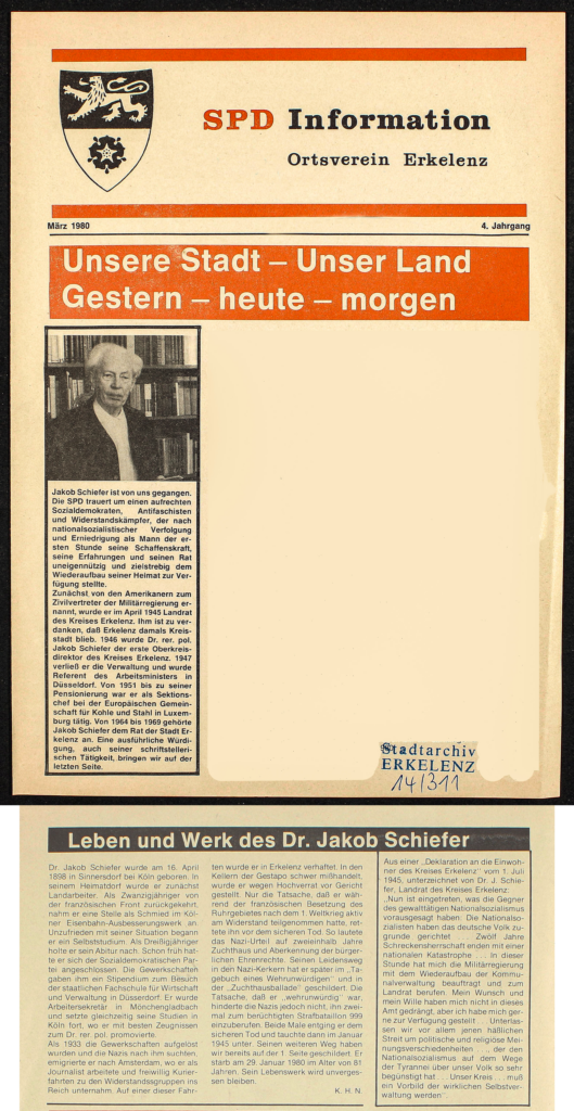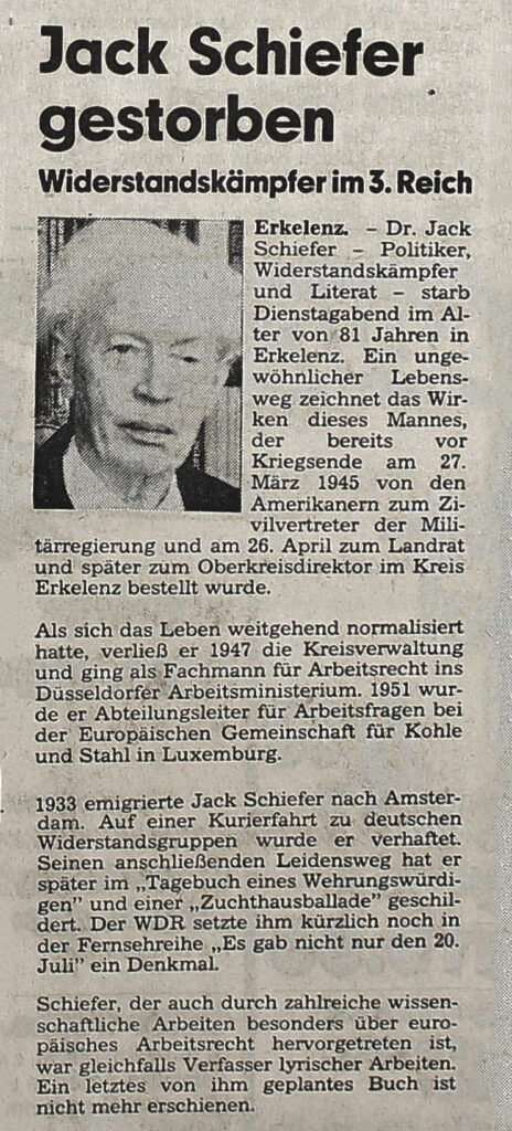 Als nach Hitlers sogenannter Machtergreifung 1933 die Gewerkschaften aufgelöst wurden, emigrierte Jack Schiefer als erklärter Gegner des NS mit der Erkelenzerin Martha Peters, die er zuvor am 16.07.1933 in Köln geheiratet hatte, nach Amsterdam, wo auch die Tochter Martha 1934 geboren wurde, als erstes von drei Kindern (Tochter Leda wird 1941 und Sohn Leander Anfang 1946 geboren). An der dortigen „Economisch-Historischen Bibliotheek“ war er mit wissenschaftlichen Untersuchungen beschäftigt und arbeitete als Wirtschaftsjournalist und wissenschaftlicher Mitarbeiter bei Professor Posthumus (1880-1960), der gute Kontakte zu den SPD-Spitzenfunktionären im Prager Exil hatte. Obwohl die Nationalsozialisten seit 1933 nach ihm suchten, verfasste Schiefer Schriften gegen sie, organisierte von Amsterdam aus gemeinsam mit anderen den Widerstand gegen Hitler, der vor allem in kritischen Artikeln und deren Verbreitung bestand. Jack Schiefer führte Nachrichten und Kurierdienste zwischen den Widerstandsgruppen im Reich und dem Ausland aus und nahm unter dem Decknamen „Niemöller“ an den Auslandskonferenzen von Sozialdemokraten als Redner teil.