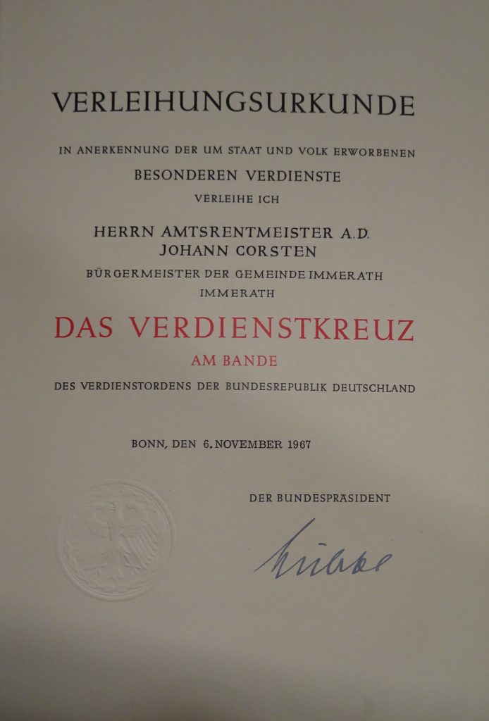Johann Corsten hat sich in seinem Leben unermüdlich in allen Bereichen des öffentlichen Lebens zum Wohle seiner Gemeinde Immerath eingesetzt und das Angesicht des Ortes nach dem 2. Weltkrieg entscheidend mitbestimmt.