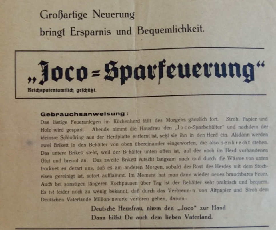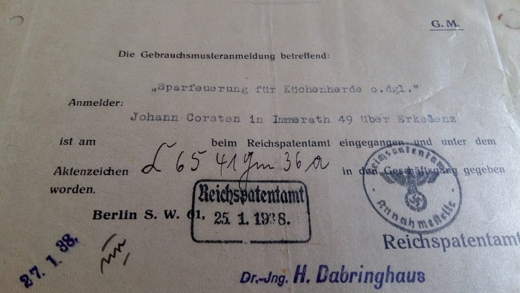 1938 wurde Johann Corsten von den Machthabern des Naziregimes aus dem Dienst entlassen und in den Ruhestand versetzt wahrscheinlich aus politischen Gründen2. Trotz seiner Entlassung war er im Dritten Reich nicht untätig. Während des Krieges half er den Immerather Bürgern bei Eingaben an die Behörden, so etwa den Bauern, um ihre Söhne zu Ernteeinsätzen vom Kriegsdienst befreien zu lassen. Da seine Pension gering war, versuchte er, durch patentierte Erfindungen den Unterhalt für die Familie aufzubessern. Eine Erfindung war die Joco-Sparfeuerung. Sie ermöglichte, dass das Feuer nachts nicht ausging und es morgens nicht erneut angezündet werden musste. Die Erfindung bestand aus einer Röhre, die senkrecht mit zwei Briketts befüllt wurde. Das untere Ende stand in der Glut. Die beiden Briketts konnten nachts so langsam verglühen, dass das Feuer am Morgen durch die bestehende Glut wieder entfacht werden konnte.