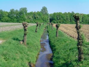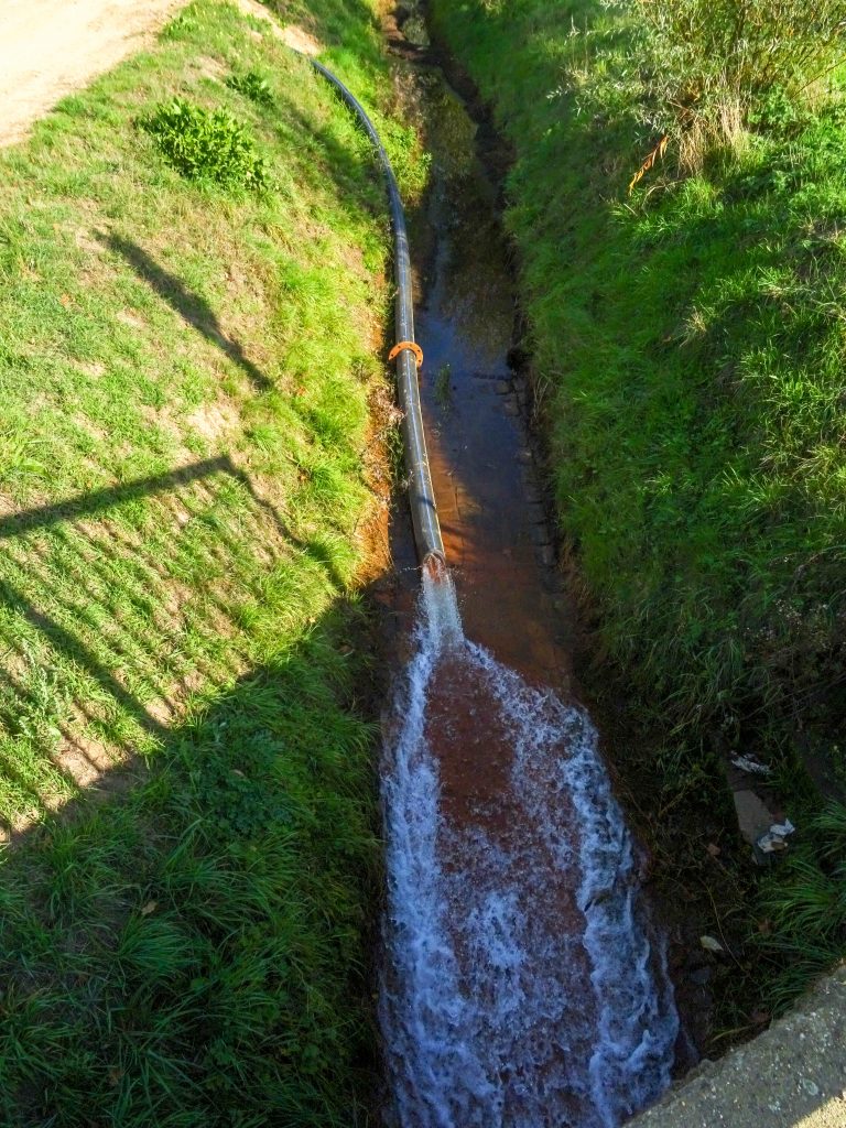 Die Köhm, ein Zufluss der Niers, der in Borschemich entsprang, musste ebenfalls auf der westlichen Seite der Autobahn mit Wasser versehen werden. Man kann die Einspeisung von der Brücke über die Köhm sehen. Es ist unglaublich, was eine Pumpe an Wasser fördert. Das schießt in großem Schwall aus dem Rohr. Daran kann man ermessen, wie viel Grundwasser der Erde sekündlich entzogen wird.