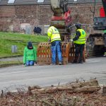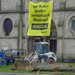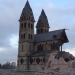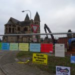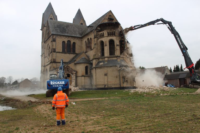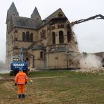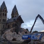Gegen 13:00 Uhr konnte die Greenpeace-Aktion friedlich beendet werden. Und nun ging alles sehr schnell. Gegen 13:00 Uhr rückte der Bagger an. Um 14:00 Uhr griff der Baggerführer mit seinem riesigen Greifarm in das Dach der Apsis, die eine Viertelstunde später bereits abgebaut war. Gegen 16:00 Uhr fehlten bereits die Apsis und das Querschiff. Ein kahler Dachtorso ragte noch aus den Trümmern heraus und man konnte ungehindert die Rosette des Portals durch das nun klein gewordene Mittelschiff sehen.
