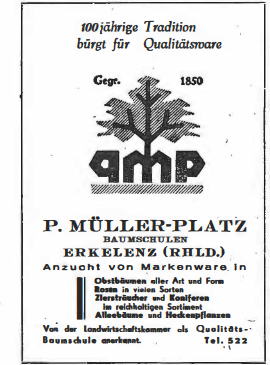 Peter Müller übernahm 1938 den Firmennamen als Eigennamen und starb 1957 85-jährig.2 Im Jahre 1938 übernahmen die beiden Söhne den Baumschulbetrieb, ab 1942 war Balduin Müller-Platz alleiniger Firmeninhaber (gestorben 1972). Ab 1967 leitete sein Sohn Heinrich Müller-Platz das Unternehmen.