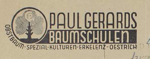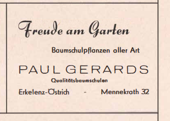 Paul Gerards, geb. 12.04.1896, gest. 15.09.1983, erlernte sein Handwerk zunächst in der Gärtnerei Schley, dann ab 1912 bei Peter Lambert in Trier, der damals als der erfolgreichste Rosenzüchter Deutschlands galt. Er kam dann nach Erkelenz zurück und gründete 1920 in Oestrich eine Baumschule, zunächst auf den Feldern des elterlichen Hofes, im Jahre 1929 verlegte er dann den Betrieb nach Mennekrath. Paul Gerards spezialisierte sich zunächst auf die Rosenzucht und Obstbäume, später kamen dann unterschiedliche Bäume und Pflanzen dazu.