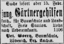 Wesentlich für die Entwicklung zum Baumschulzentrum war auch, dass Platz und Schley zahlreiche Schüler ausbildeten, die später, zum Teil nach Aufenthalten in auswärtigen Betrieben, in Erkelenz ebenfalls Baumschulen und Gärtnereien gründeten. So gründete Hermann Morjan 1893 eine Baumschule in Grambusch, Peter Goertz 1900 in Lövenich, Conrad Porten 1921 in Erkelenz, Paul Gerards 1925 in Oestrich, ab 1929 dann in Mennekrath und Josef Hallen 1932 in Golkrath.4