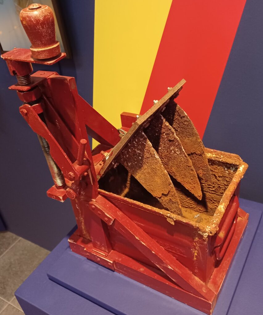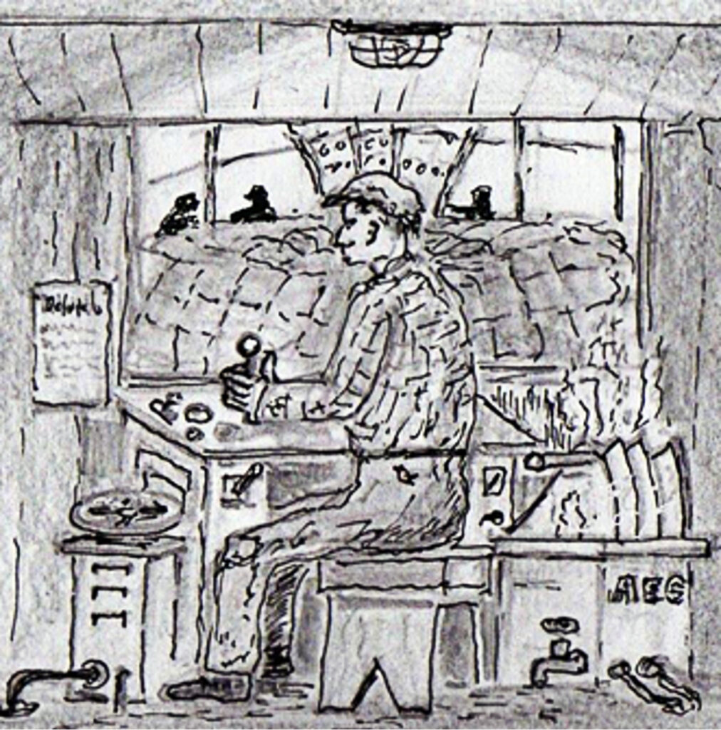 Herr Geiser saß am Steuerpult. Mit einer Hand versenkte er mehrere metallisch glänzende, dünne Kreissegmente, die wie eine große Brotschneidemaschine aussahen, in einen Behälter, der mit Salzwasser gefüllt war. Es zischte und dampfte enorm. Mit dieser Anlage wurde die Geschwindigkeit der Raupe gesteuert. Beim Ertönen der Sirene schloss sich das Verdeck oder öffnete sich wieder.