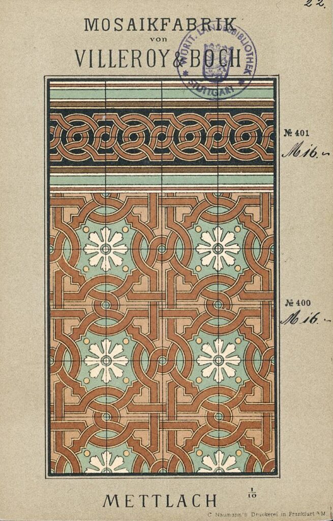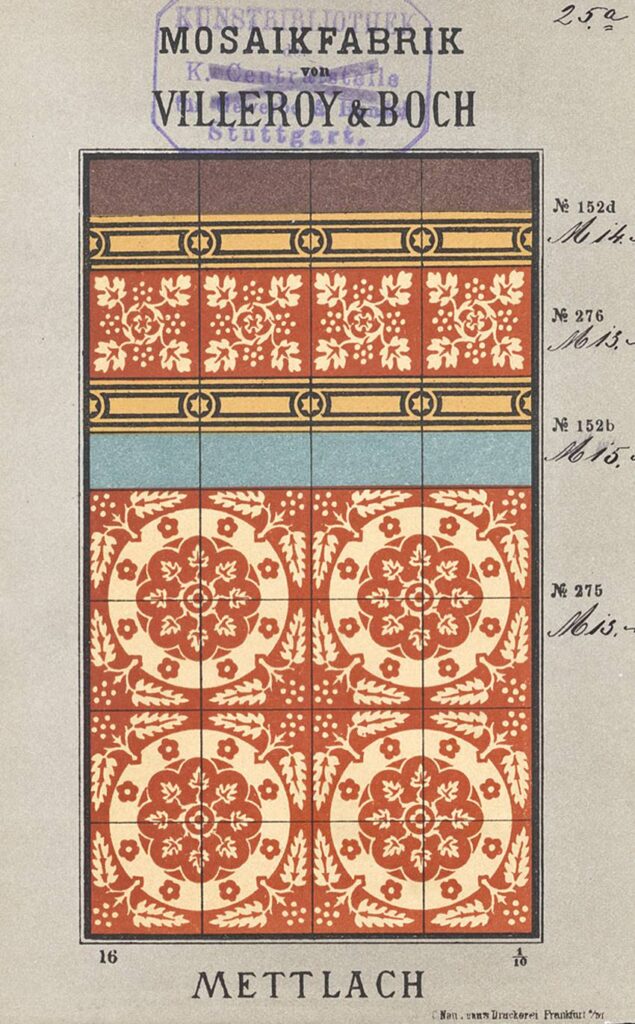Unter https://www.geschichte-der-fliese.de/Musterbl_Wandplatten.html sind zahlreiche Muster der Mettlacher Kirchenfliesen abgebildet. Auf der gleichen Seite ist auch „Die Geschichte der Fliese“ nachlesbar.