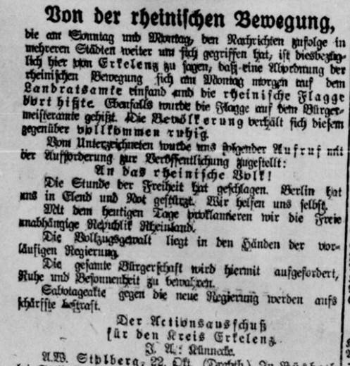 Am Sonntag, den 21. Oktober mittags gegen 12 1/2 Uhr erschien ein Auto mit fremden Personen in hiesiger Stadt, die dann an verschiedenen Stellen in der Stadt rote Plakate mit der Aufschrift, dass in Aachen die Rheinische Republik ausgerufen wurde, anbringen. Die Bürgerschaft verhielt sich ablehnend, die hiesigen Sonderbündler nahmen dann unter der Führung des Metzgermeisters Isidor Künnecke ihre Tätigkeit auf. Sie schlugen ihr Büro in dem Hause des ?Apothekers? Otto Arenz -auch ein Anhänger der Bewegung- auf“.