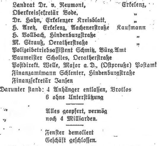 Künnecke notierte u. a. noch, dass er seine Gastwirtschaft geschlossen habe und einige Fenster bei ihm demoliert wurden. Künnecke hat später Erkelenz verlassen. In einem Brief an den Bürgermeister hat Künnecke sich später für sein Tun entschuldigt.3