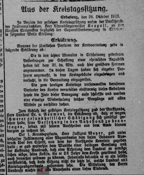 Am Nachmittag des 23. Oktober traf sich der Kreistag zu einer nichtöffentlichen Sitzung. Dabei wurde in einer Erkärung sämtlicher Mitglieder des Kreistages die Aktion der Separatisten eindeutig verurteilt. In dieser Sitzung gab übrigens Landrat von Reumont seinen Rücktritt aus gesundheitlichen Gründen bekannt. Dieser wurde jedoch nicht angenommen und nach einem Erholungsurlaub war von Reumont noch weitere sechs Jahre im Amt.