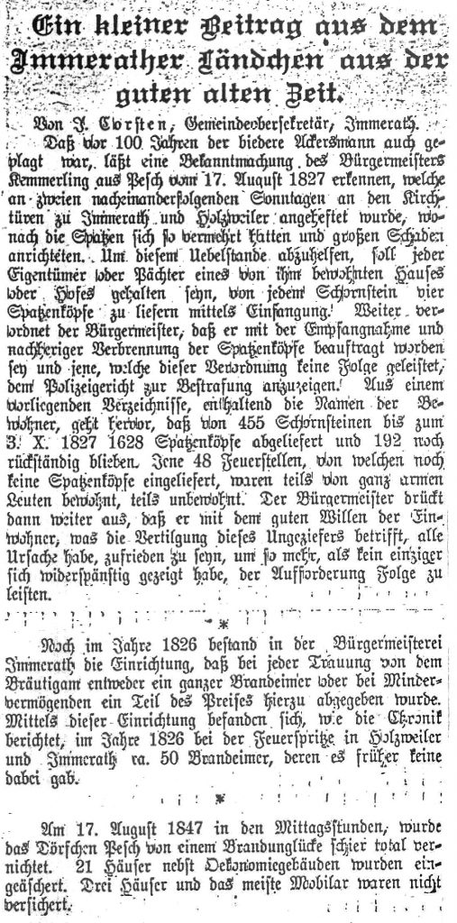 Daß vor 100 Jahren der biedere Ackersmann auch geplagt war, läßt eine Bekanntmachung des Bürgermeisters Kemmerling aus Pesch vom 17. August 1827 erkennen, welche an zweien nacheinanderfolgenden Sonntagen an den Kirchtüren zu Immerath und Holzweiler angeheftet wurde, wonach die Spatzen sich so vermehrt hatten und großen Schaden anrichteten.Um diesem Uebelstande abzuhelfen, soll jeder Eigentümer oder Pächter eines von ihm bewohnten Hauses oder Hofes gehalten seyn, von jedem Schornstein vier Spatzenköpfe zu liefern mittels Einfangung. Weiter verordnet der Bürgermeister, daß er mit der Empfangnahme und nachheriger Verbrennung der Spatzenköpfe beauftragt worden sey und jene, welche dieser Verordnung keine Folge geleistet, dem Polizeigericht zur Bestrafung anzuzeigen. Aus einem vorliegenden Verzeichnisse, enthaltend die Namen der Bewohner, geht hervor, daß von 455 Schornsteinen bis zum 3. X. 1827 1628 Spatzenköpfe abgeliefert und 192 noch rückständig blieben. Jene 48 Feuerstellen, von welchen noch keine Spatzenköpfe eingeliefert, waren teils von ganz armen Leuten bewohnt, teils unbewohnt. Der Bürgermeister drückt dann weiter aus, daß er mit dem guten Willen der Einwohner, was die Vertilgung dieses Ungeziefers betrifft, alle Ursache habe, zufrieden zu seyn, um so mehr, als kein einziger sich widerspänstig gezeigt habe, der Aufforderung Folge zu leisten.1