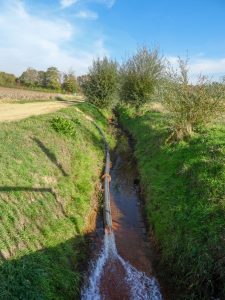 Die Köhm, ein Zufluss der Niers, der in Borschemich entsprang, musste ebenfalls auf der westlichen Seite der Autobahn mit Wasser versehen werden. Man kann die Einspeisung von der Brücke über die Köhm sehen. Es ist unglaublich, was eine Pumpe an Wasser fördert. Das schießt in großem Schwall aus dem Rohr. Daran kann man ermessen, wie viel Grundwasser der Erde sekündlich entzogen wird.1