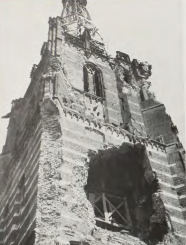 Nach einer mir soeben zugekommenen mündlichen Mitteilung des Pionier- Leutnant Jakobs soll die Erkelenzer Pfarrkirche aus militärischen Gründen durch Sprengung niedergelegt werden. Damit würde das in rheinischen Landen weithin bekannte gotische Baudenkmal mit dem besonders monumentalen sieben-geschossigen Turm untergehen. Besonders der Turm, ein 500-jähriges stolzes Wahrzeichen des alten niederrheinischen Flachlandes, steht in seiner Wucht und reichen Architektur mit an erster Stelle hinter den Kölner Domtürmen, in seiner Höhe (83 Meter) an dritter Stelle hinter den rheinischen kirchlichen Bauten.