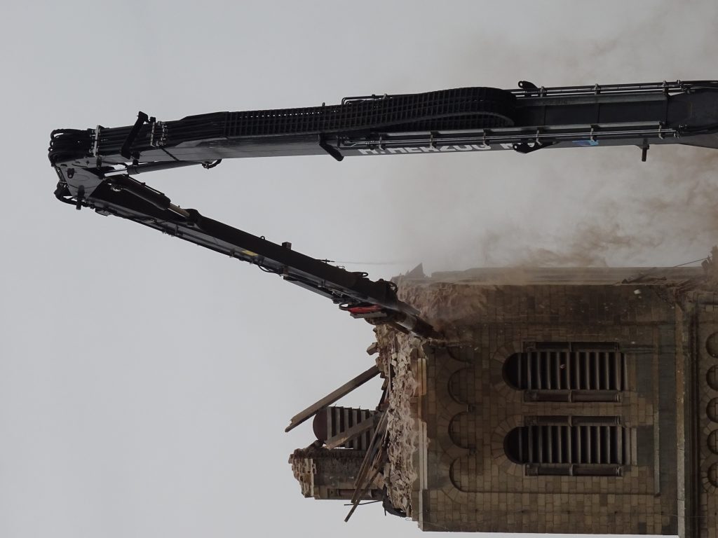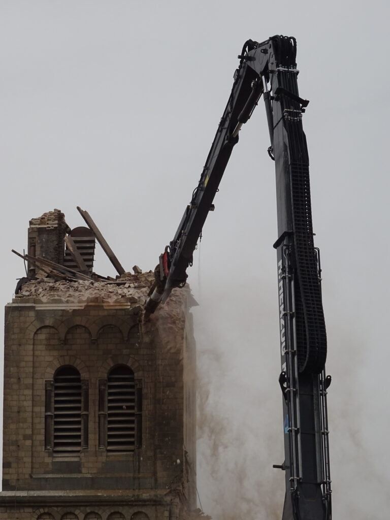 Gegen 13:00 Uhr konnte die Greenpeace-Aktion friedlich beendet werden. Und nun ging alles sehr schnell. Gegen 13:00 Uhr rückte der Bagger an. Um 14:00 Uhr griff der Baggerführer mit seinem riesigen Greifarm in das Dach der Apsis, die eine Viertelstunde später bereits abgebaut war. Gegen 16:00 Uhr fehlten bereits die Apsis und das Querschiff. Ein kahler Dachtorso ragte noch aus den Trümmern heraus und man konnte ungehindert die Rosette des Portals durch das nun klein gewordene Mittelschiff sehen.