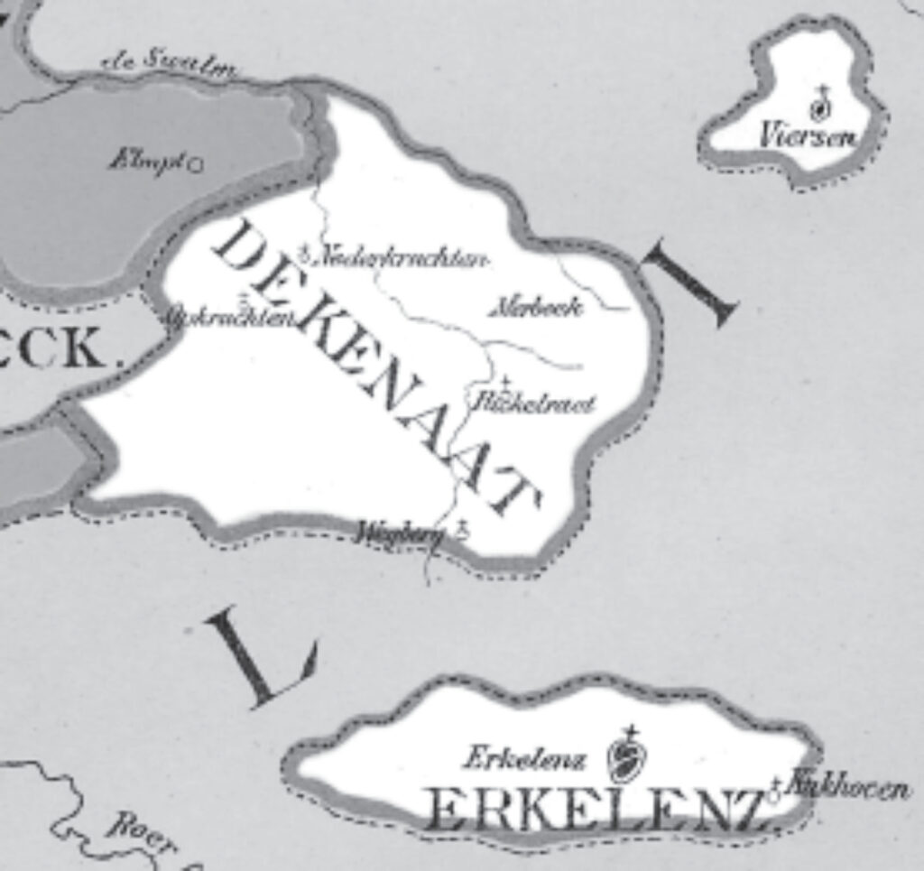 In der päpstlichen Urkunde (Circumscriptionsbulle) „Regimini ecclesiae“ (1561) wurden dem neuen Bistum Roermond alle geldrischen Gebiete zugewiesen. Diese Setzung betraf Erkelenz konkret, denn damit wechselte Erkelenz aus dem Bistum Lüttich in das neu begründete Bistum Roermond. Dieses Bistum wurde aus Gebieten des Erzbistums Köln und des Bistums Lüttich gebildet. Erkelenz war ein Dekanat im geldrischen Oberquartier; zu diesem Dekanat gehörten Rickelrath, Merbeck, Niederkrüchten und Oberkrüchten. Erkelenz stellte mit Kückhoven eine Exklave dar.