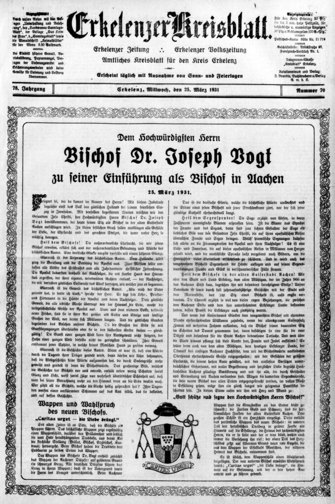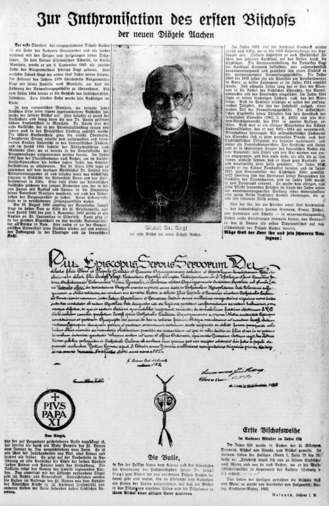 Am 14. Juni 1929 wurde das Preußische Konkordat unterzeichnet; es regelte die Verhältnisse zwischen Staat und Kirche nach den politischen Umwälzungen infolge des 1. Weltkrieges neu und ersetzte das bisherige Konkordat aus dem Jahr 1921. Dieser Vertrag wurde vom preußischen Ministerpräsidenten Otto Braun und dem apostolischen Nuntius Eugenio Pacelli, dem späteren Papst Pius XII., verhandelt. Man schuf so die staatsrechtlichen Voraussetzungen für die geplante Wiedererrichtung des Bistums Aachen. Am 13. August 1930 wurde durch die Päpstliche Bulle „Pastoralis officii nostri“ die Wiedererrichtung des Bistums Aachen verfügt. Dr. Joseph Heinrich Peter Vogt (1865 – 1937), der vormalige Dompropst und Generalvikar von Köln, wurde am 25. März 1931 der erste Bischof. Das Erkelenzer Kreisblatt berichtete an diesem Tag auf zwei Seiten über dieses Ereignis der Inthronisation.