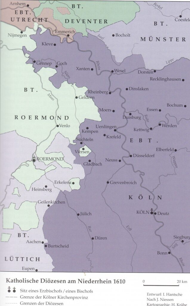 Die erste Änderung der Bistumszuordnung von Erkelenz findet im Jahr 1559 statt; es ist die Herrschaftszeit von Philipp II. (er hatte 1555 die Nachfolge seines Vaters Karl V. angetreten) und die Zeit der Reformation. Während des Konzils von Trient (1545 – 1563), dessen Hauptanlass die Auseinandersetzung mit der sich ausbreitenden Reformation war, wurde am 26. Juni 1548 in Augsburg der „Burgundische Vertrag“ geschlossen, durch den sich die Reichsverfassung änderte. Dieser Vertrag regelte die staatsrechtliche Stellung der Habsburgischen Niederlande im Heiligen Römischen Reich. Das Bistum Roermond wurde neu errichtet und gehörte als Suffraganbistum zum ebenfalls neu errichten Erzbistum Mecheln. „Philipp II. versuchte mit verstärkter Kraft, den Protestantismus in den Niederlanden auszurotten. Dafür wandte er nicht nur politische und militärische Machtmittel an, […] sondern versuchte auch durch eine Änderung der Kirchenorganisation, den Katholizismus in den niederländischen Gebieten zu stützen. Ein wesentliches Element war dabei die Änderung der Bistumsstruktur.“3 Die so gekennzeichneten Handlungsmotive des Königs werden durch die folgende Tatsache untermauert: Während vor 1559 in den Niederlanden nur sechs verhältnismäßig große Bistümer existierten, erhöhte Philipp II. die Zahl der Bistümer auf 19, um auf diesem Weg die katholische Erneuerung zu forcieren. Idealerweise sollte nicht nur die Ausbreitung des Protestantismus beendet werden, sondern sein Wunsch war, die schon erfolgte Reformationsentwicklung rückgängig zu machen.