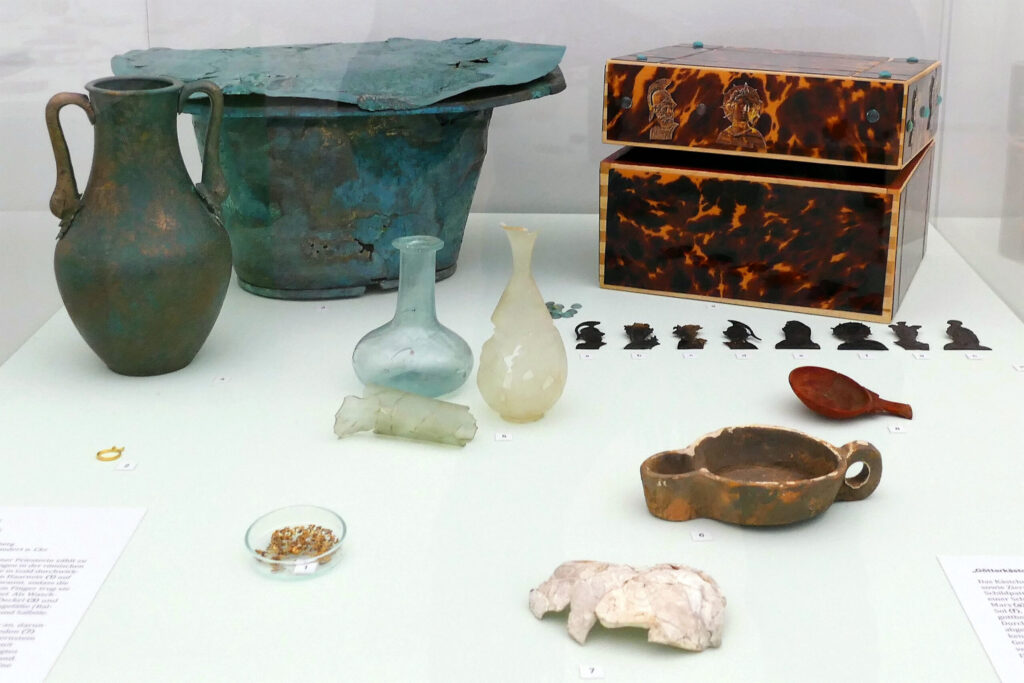 Bei diesem Holzkästchen, hier in Rekonstruktion, handelt es sich um eine Acerra, ein Behältnis zur Aufbewahrung von Weihrauch. Das Kästchen (9) war mit halbkugeligen Glaskügelchen (10) sowie mit Zierstreifen und acht figürlichen Zierappliken aus Schildpatt (11), also Hornschuppen des Rückenpanzers einer Schildkröte, besetzt: Sie zeigen die römischen Götter Mars, Apollo, Diana, Minerva, Juno und Sol, aber auch die ägyptisch, griechisch-römische Mischgottheit Hermanubis und den ägyptischen Gott Serapis.
