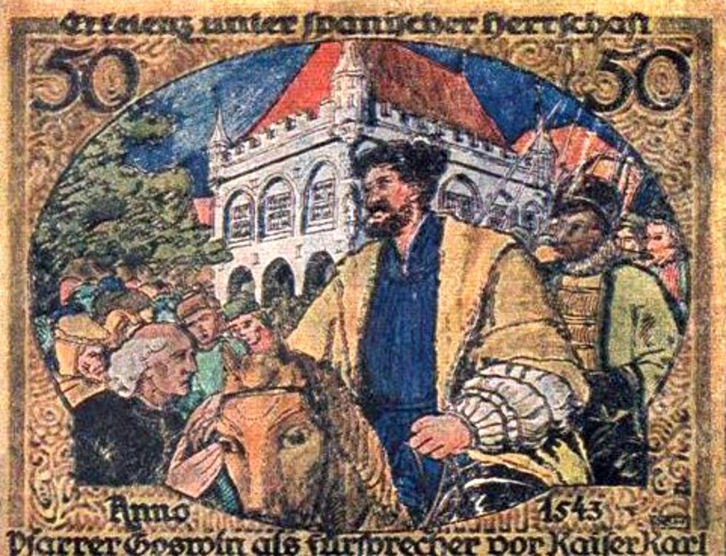 Die anhaltenden Kriege waren für die Bevölkerung eine schwere Belastung; man lebte in Angst vor Plünderung und Brandschatzung. Daher schickte Erkelenz dem Kaiser seinen Pfarrer Goswin von Wockerath entgegen, Unterwerfung anzeigend und um Frieden bittend. Karl V., der sich auf dem Weg nach Roermond befand, besuchte am 29. August 1543 Erkelenz und nahm im Haus des Pfarrers sein Mittagsmahl ein.28